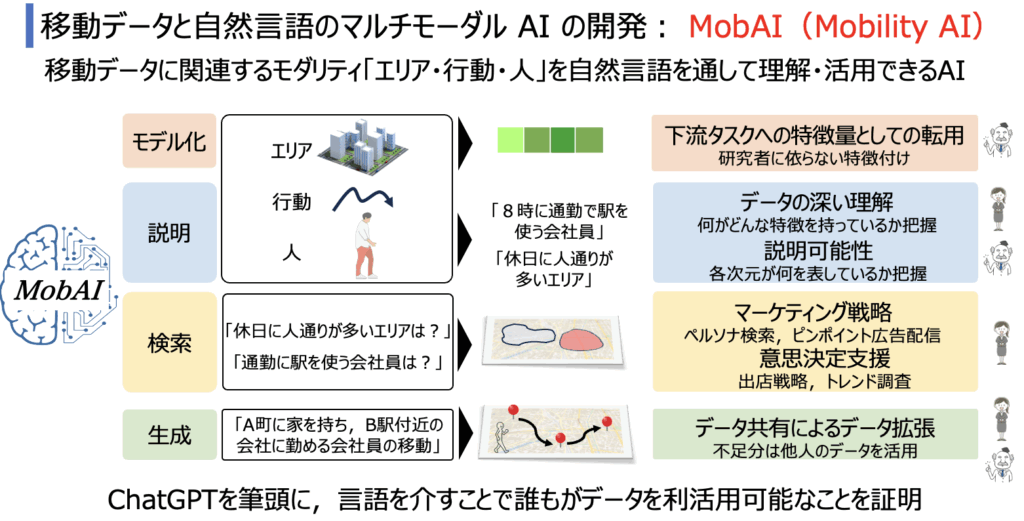 都市空間における人々の移動データとは、様々な事象が絡み合う複雑なデータであり、分析には専門的知識と豊富な経験が要求されます。 そのため、研究者は目的に合わせたデータのモデル化を行い、クラスタリングや可視化を通してデータの意味を言語化し、社会課題解決に当たります。 しかし、データの意味を解釈できたとしても、そこにモデリング結果とのインターフェースを作ることまではしません。 つまり、これは非研究者がモデルを理解できず、活用できないということを意味します。 結果、人口密度を算出したり、OD分析をしたりと、表面的な分析による限られた問題解決にしか繋がらないという現実があります。 それに対し、近年自然言語を通して誰もが画像や音声などを生成・検索・分類可能な AI が登場しました。 言語を通したデータの利活用というこのパラダイムシフトが、時空間データの研究分野にも、必要だと私は考えています。 そこで本研究では、自然言語を介した移動データ理解のため、移動データと自然言語のマルチモーダルAI(MobAI)を開発します。 MobAIは、分析者の移動データに対する意味理解を支援し、非分析者の移動データ利活用を促進するものです。 これまで障壁だった移動データ分析の難解さと企業間データ共有のプライバシー問題を解決し、都市計画や商業戦略の策定など、様々な分野でのデータ駆動型意思決定を支援することを目指します。