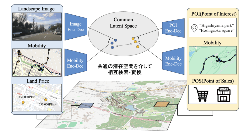 都市における各エリアは、位置している建物や周囲の風景、訪問する人々の移動傾向など多様な特徴を内包しており、出店戦略や都市計画の際にはそのエリアの多様な特徴を考慮する必要があります。 一方、都市ではセンサやモバイル端末を通して様々な種類のデータの蓄積が進んでいます。 しかしこれらのデータは単体で使われることが多く、異なる種類のデータの間にある関係性のモデル化は不足しています。 本研究では、異なる種類のデータを共通の潜在空間にマッピングすることで、データ間の検索や変換を行います。 これによって、多様なデータを通じたエリアの多様な側面の分析を可能にし、出店戦略や都市計画への活用を目指します。