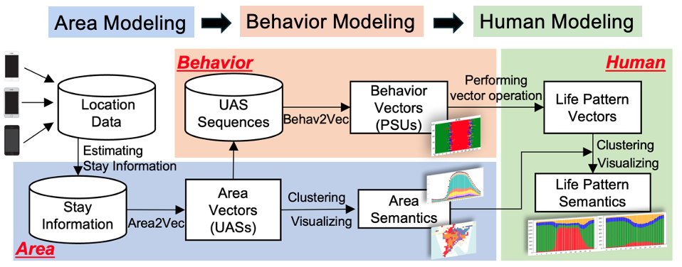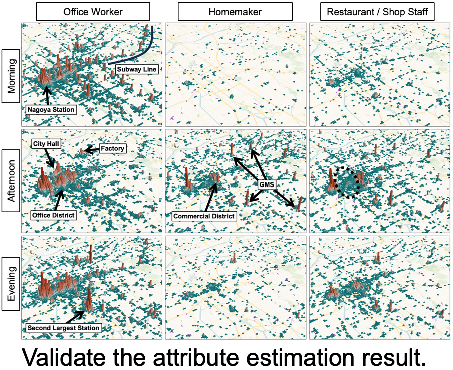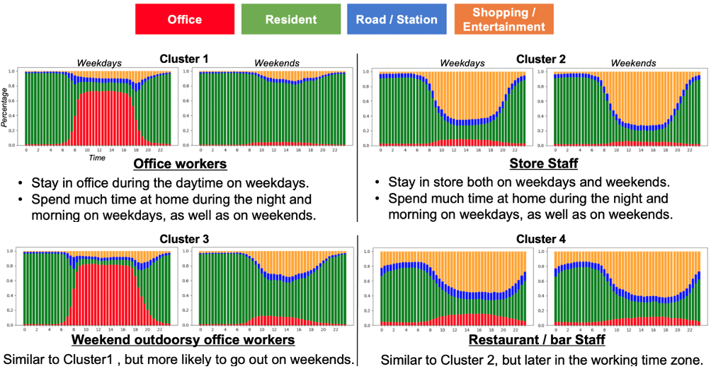 論文「Unveiling Human Attributes through Life Pattern Clustering using GPS Data Only」というタイトルで、GPSデータを使って人々の生活パターンをクラスタリングするためのフレームワーク「LPSeL」を提案しました。LPSeL は、GPSデータから都市空間におけるエリアごとの特性を抽出し、それに基づいて人々の行動パターンをモデリングする手法です。この手法によって、緯度・経度・タイムスタンプのみから構成されたGPSデータから、例えば「オフィス勤務者」や「商業エリアの店舗スタッフ」といった職業属性の推定が可能になります.また、休日は「休日はインドア派」や「週末に仕事が多い人」といった、生活スタイル属性の抽出も可能です。本研究は、位置情報の持つ可能性を最大限に引き出し、自治体の政策立案からマーケティング戦略まで、都市の様々な場面での意思決定に役立つものだと考えています。