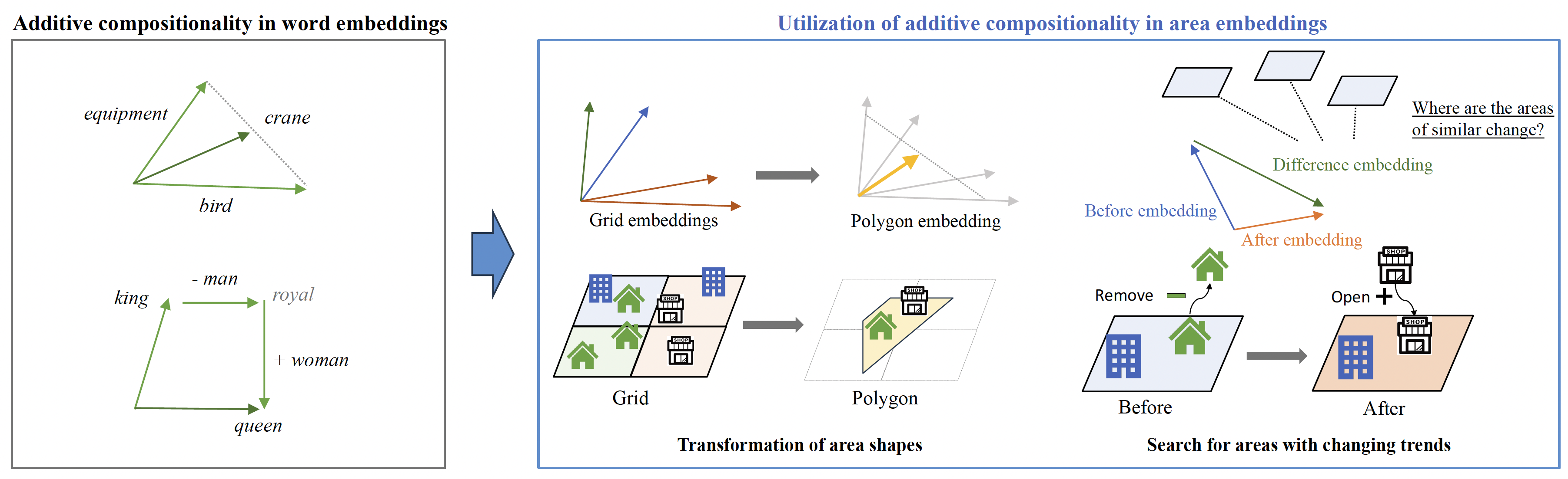 論文「Additive Compositionality in Urban Area Embeddings Based on Human Mobility Patterns」というタイトルで、エリア埋め込みの算術演算に関する手法を提案しました。エリア埋め込みとは、GPSデータから都市の各エリアの移動傾向(昼に人が集まるオフィスエリア、休日に人が集まるエンタメエリアなど)をベクトル空間にマッピングする手法です。本研究では、このエリアごとのベクトルの足し算や引き算によって、エリアの形状の変換や、エリアの傾向の変化を捉えることを提案しています。特に各エリアの移動傾向の変化を捉えることで、都市政策や店舗の出店の効果の比較や、似た変化が起こった地区を探すことができ、都市計画や出店戦略に役立つものになっています。
